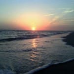 Sunset with gentle lapping waves.